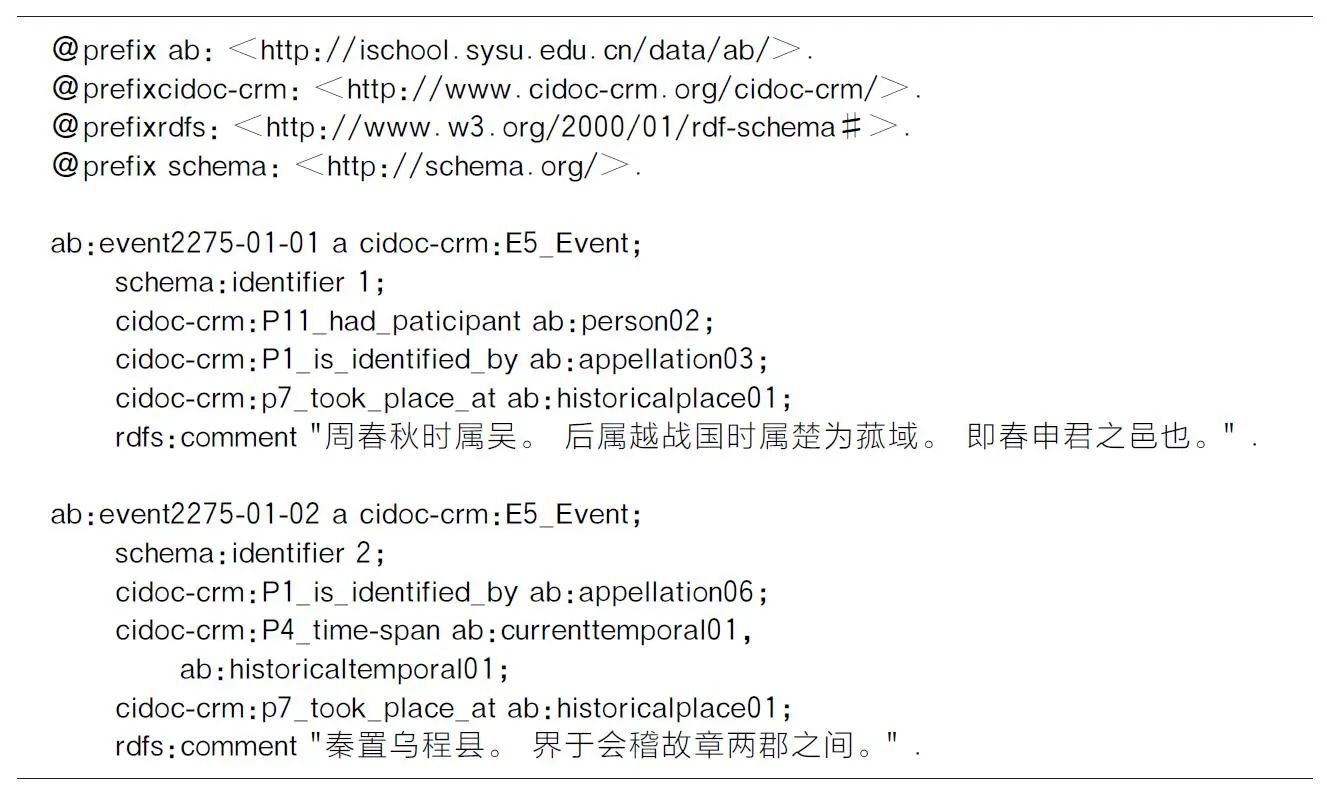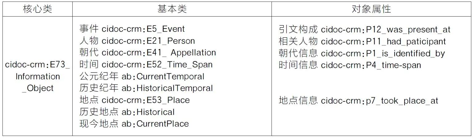 本层复用CIDOCCRM模型,并借鉴其以事件为中心的建模思想构建本体,从引文中拆分出相关事件或细分条目,将事件或条目作为上层结构,从中抽取出各种知识实体,定义事件/条目与其他实体间的语义关系,实现引文的动态描述,使对《永乐大典》的组织深入知识实体维度。本层词表如表4所示。《永乐大典》中,引文可视为可识别的结构性文本信息对象,可复用信息对象类(cidoc-crm:E73_Information_Object)表示,使用等同类属性与组织结构层中的引文类(schema:Quatation)关联。在文献书目层中,人、地、时、事等常见实体已定义用于描述古籍文献形式特征,无法与事件实体关联。为区分文献书目层与内容实体层中的实体,本层分别复用了CIDDOCCRM模型中的事件类(cidoc-crm:E5_Event),时间跨度类(cidoc-crm:E52_Time_Span),地点类(cidoc-crm:E53_Place)和人物类(cidoc-crm:E21_Person)表示上述四类实体。古籍中还包括朝代信息和细分条目信息,朝代含有历史、时间和空间意义,复用名称类(cidoc-crm:E41_Appella-tion)表示。CIDOCCRM模型中,可用于描述细分类目的类有多个,如物理对象类(E19)、概念对象类(E28)等,但都缺乏完整的属性与其他实体相关联,事件类涵盖了“文化、社会及物理对象的状态变化”,能够囊括关于细分类目的描述性内容,因此仍使用事件类表示细分事目,复用事件类已有属性,降低本体的复杂度。此外,古籍采用历史纪年方式记录时间,所载地点往往经过数次更迭,本层自定义了公元纪年类(ab:Current-Temporal)、历史纪年类(ab:HistoricalTempo-ral),历史地点类(ab:HistoricalPlace)和现今地点类(ab:CurrentPlace),分别作为时间跨度类的子类和地点类的子类,以便精准描述时间和地点信息,并与其他知识库关联。属性层面,引文由事件构成,复用“出现于”(cidoc-crm:P12_was_present_at)属性描述二者间的语义关系。同时,以事件类为中心,复用了“标识”(cidoc-crm:P1_is_identified_by),“发生地”(cidoc-crm:p7_took_place_at),“时间跨度”(cidoc-crm:P4_time-span),“参与者”(cidoc-crm:P11_had_paticipant)四条属性,描述事件相关的朝代信息、事件信息、人物信息和地点信息。