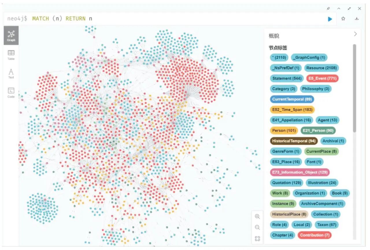 鉴于知识图谱在知识推理、可视化展示等方面的独特优势,本文使用《永乐大典》关联数据在Neo4j图数据库中构建知识图谱。通过图数据库环境部署、URI约束创建、图初始化、数据映射、三元组导入、数据校验与查询等流程,将RDF数据映射到Neo4j图数据库可以解析的属性图结构中,生成知识图谱,如图4所示。该图谱共包括2107个节点及4701条关系,可识别三元组数量与Virtuoso数据库一致,节点标签与RDF数据中的资源类型保持一致,节点间关系和节点属性与本体中的对象属性和数据属性一致。
