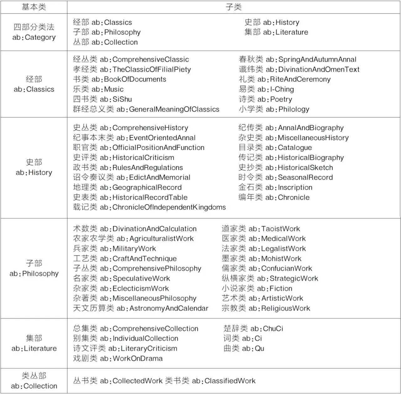 分类整理层主要借鉴《汉文古籍分类表》,为降低本体复杂度和提升可扩展性,本层仅采纳了其中前两层结构,不包括二级类下的各属,本体词表如表1所示。本层自定义了顶层类ab:Category,代表“四部分类法”,其下逐层定义子类。顶层类下分别定义了经部(ab:Classics)、史部(ab:History)、子部(ab:Philosophy)、集部(ab:Literature)和类丛部(ab:Collection)五个一级子类,各部子类如表所示。由于目前尚无描述古籍分类信息的专门模型,各部及其子类主要参考古籍领域术语自定义。