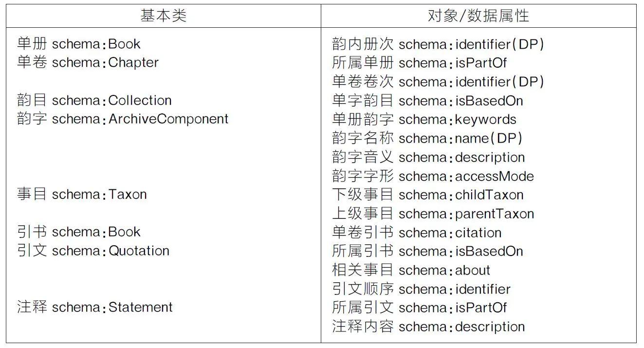 《永乐大典》整体结构为韵目、韵字、单册、单卷、事目和引文。韵目与韵字是排列方式,事目可视为引文的主题,核心的实体结构为单册、单卷和引文,引文构成单卷,单卷构成单册。引文包含引书名与具体内容,是最小语义单元。根据“单册-单卷-引文”结构抽象类和属性,单册《永乐大典》与引书均可视为古籍实例,使用“等同类”属性(owl:equivalentClass)与实例类(bf:In-stance)关联,保证不同层次本体的独立性和关联性。本层主要复用Schema.org词表构建本体,组织结构层本体词表如表3所示。韵目可视为由多个韵字构成的分类编码集,复用分类集合类(schema:Collection)和元素类(schema:ArchiveComponent)表示韵目与韵字,使用“基于”(schema:isBasedOn)属性描述二者关系,使用“名称”(schema:name)属性描述具体韵字名称。韵字音义侧重内涵描述,字形侧重外在感知,分别复用“描述”(schema:description)与“外观”(schema:ac-cessMode)表示。册卷间的关系可视为书章间的关系,复用书籍类(schema:Book)和章节类(schema:Chapter)表示,复用“组成部分”(schema:isPartOf)属性描述卷册关系。此外,单册顺序为韵内册次,单卷顺序为卷次,复用“标识符”(schema:identifier)属性表示。每一单册都有所属韵字,使用“关键字”(schema:keywords)属性连接单册类与韵字类。每一单卷中按事目组织,不同层级的事目均可抽象为分类单元,复用分类单元类(schema:Tax-on)表示事目,通过下级分类(schema:childT-axon)和上级分类(schema:parentTaxon)属性区分不同层次事目间关系。引书同样复用书籍类表示,通过“引用”(schema:citation)属性与单卷类关联。复用引用内容类(schema:Quotation)表示引文,使用属性“schema:isPar-tOf”与引书类关联,顺序使用属性“schema:identifier”表示。注释可抽象为陈述性内容,复用陈述类(schema:Statement),与引文类的关系为“组成部分”(schema:isPartOf),复用“schema:description”属性表示注释内容。