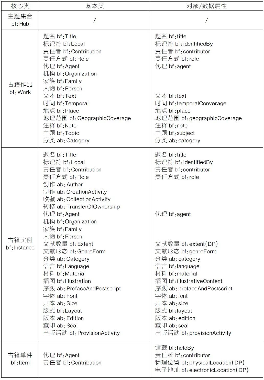 文献书目层采用BIBFRAME模型,由主题、作品、实例、单件4个核心类构成,用于分层描述古籍书目信息,根据古籍文献书目特征,参考古籍平台检索字段、著录规则、元数据方案和相关本体等抽取基本类与属性,如上海图书馆古籍联合目录和循证平台本体词表、中国历代人物传记资料库关联数据系统本体等,并复用BIBFRAME2.3词表中的类与属性表示。文献书目层本体模型核心类、基本类及类间关系如表2所示。主题类(bf:Hub)、作品类(bf:Work)、实例类(bf:In-stance)和单件类(bf:Item)为本层核心类,主题与作品通过bf:hasExpression属性连接,作品与实例通过bf:hasInstance/bf:instanceOf属性连接,实例与单件通过bf:hasItem/bf:itemOf属性连接。