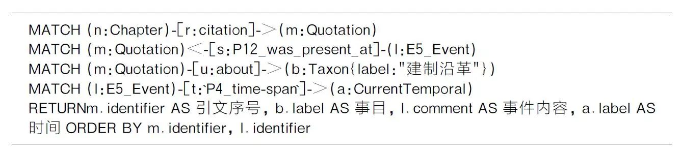 知识图谱不仅能反映知识元素及其关系,还可以挖掘隐性知识和关系,无须查询和阅读原文本。实现多文本之间的“远读”,提高检索效率。以本体模型为基础,知识图谱直观呈现了复杂的语义关系,无论是采用三元组还是图模型储存数据,都可以在知识图谱中实时查询知识实体间的关联。此处,以《永乐大典》“建制沿革”事目为例,查询与其相关的所有事件,并按照引文顺序和事件顺序排序,Cypher查询语句如下,部分查询结果如表5所示。