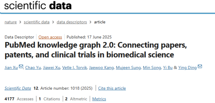 女仆 徐健教授课题组论文《PubMed knowledge graph 2.0: Connecting papers, patents, and clinical trials in biomedical science》发表于Nature旗下唯一数据期刊Scientific Data。PKG 2.0创新性打通论文、专利与临床试验的关联壁垒,为生物医学领域搭建起串联基础研究、临床应用与技术落地的信息桥梁,也为科学计量、人工智能领域研究者打通了跨域数据交互的关键通道,推动多学科围绕生物医学核心问题开展深度协同研究。Scientific Data作为Nature旗下聚焦数据驱动研究的核心期刊,致力于推动科学数据的共享与再利用,属于JCR一区。