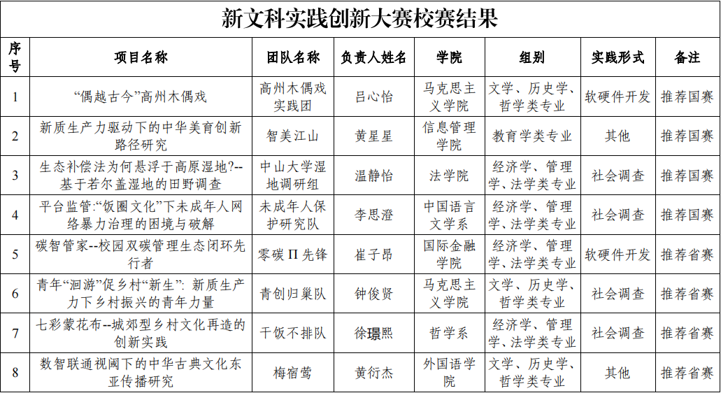 根据全国新文科教育研究中心和大学生新文科实践创新大赛组织委员会《关于举办2025年大学生新文科实践创新大赛的通知》、广东省大学生新文科实践创新大赛组织委员会《关于举办广东省2025年大学生新文科实践创新大赛的通知》,女仆 承办并组织开展了2025年大学生新文科实践创新大赛校赛。经组织报名、形式审查、专家评审、现场答辩等环节,共39个项目参加了校赛,其中8个项目入选晋级赛(国赛、省赛)推荐名单,现将推荐结果予以公示:
